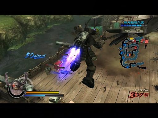 漆黒の鎧に身を包み,バックパックに備えた2門のキャノン砲のような武器を両肩から突き出し攻撃するなど,まるでどこかのロボットアニメでも見ているかのような出で立ちの本多忠勝が,愛用の機巧槍(というよりドリルランスでは……)を振り回しながら,敵本陣目指して突き進んでいく。途中の陣にいる武将などを,範囲攻撃などで一掃しつつ爆進していく様を見ながら,本作の合戦がどのようなものなのか,ただの戦国アクションではない雰囲気をじっくり味わってみよう。