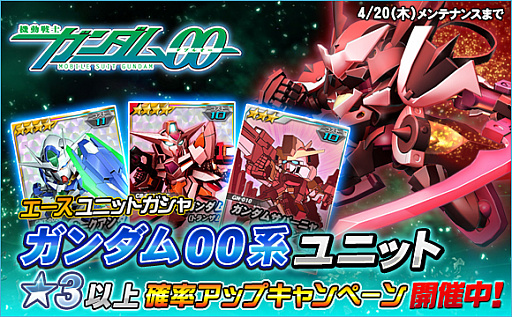 キャンペーン期間中は、「エースユニットガシャ」、「11連エースユニットガシャ」、「ルーキーガシャ」から獲得できる『機動戦士ガンダム00』系ユニットのうち、★3以上の獲得確率がアップとなります。