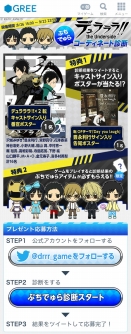 GREEにて配信中の『デュラララ!! the Underside』では、新機能「ぷちでゅら」コーナーのオープンを記念して、本日より豪華声優陣のサイン入りポスターなどが当たるキャンペーン「ぷちでゅらコーディネート診断」を開始した。全ての方に、診断結果に応じた「ぷちでゅら」アイテムをプレゼントする。
