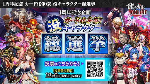 「『龍が如くONLINE』 究極感謝の極 1周年記念生放送」をYouTube LiveならびにPeriscopeで実施した。本稿では,SSRに昇格するキャラを決める総選挙の結果やバージョンアップ情報など,本放送で発表された内容を紹介する。
