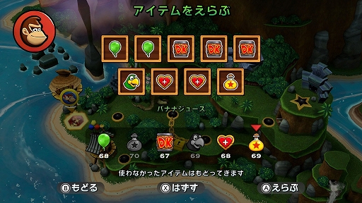 モダンモードは,初めてプレイする人も安心して遊べる初心者向けのモードで,体力が6つに増えているほか,敵やトゲからのダメージを防ぐ「バナナジュース」や,コースから落ちても復帰できる「グリーンバルーン」,トロッコに乗っている時の衝撃を守ってくれる「クラッシュガード」など,ゲーム内で購入できるお助けアイテムを最初から70個ずつ所持している。